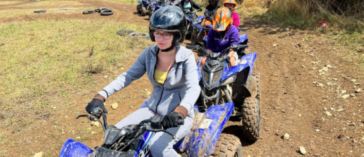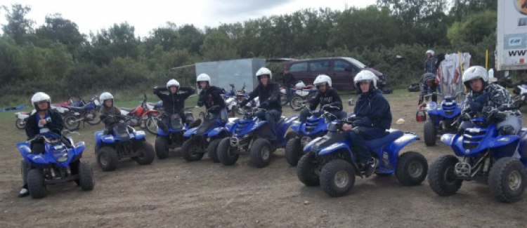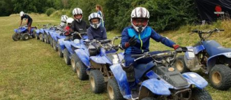 Ce stage peut aussi bien accueillir des débutants que des jeunes plus expérimentés. Les jeunes pratiquent 5 séances de Quad par semaine : 2h de Quad avec au minimum 1h30 de roulage. L'activité se déroule généralement le matin. La répartition des groupes s'effectue par âge et niveau de pratique. Les contenus et machines sont toujours adaptés au niveau des participants, seules les règles de sécurité sont les mêmes pour tout le monde. Les quads utilisés sont : Badger 80 et XFM 90. Un stage intensif Quad avec 3 séances supplémentaires, soit 8 séances sur la semaine, est proposé en option.